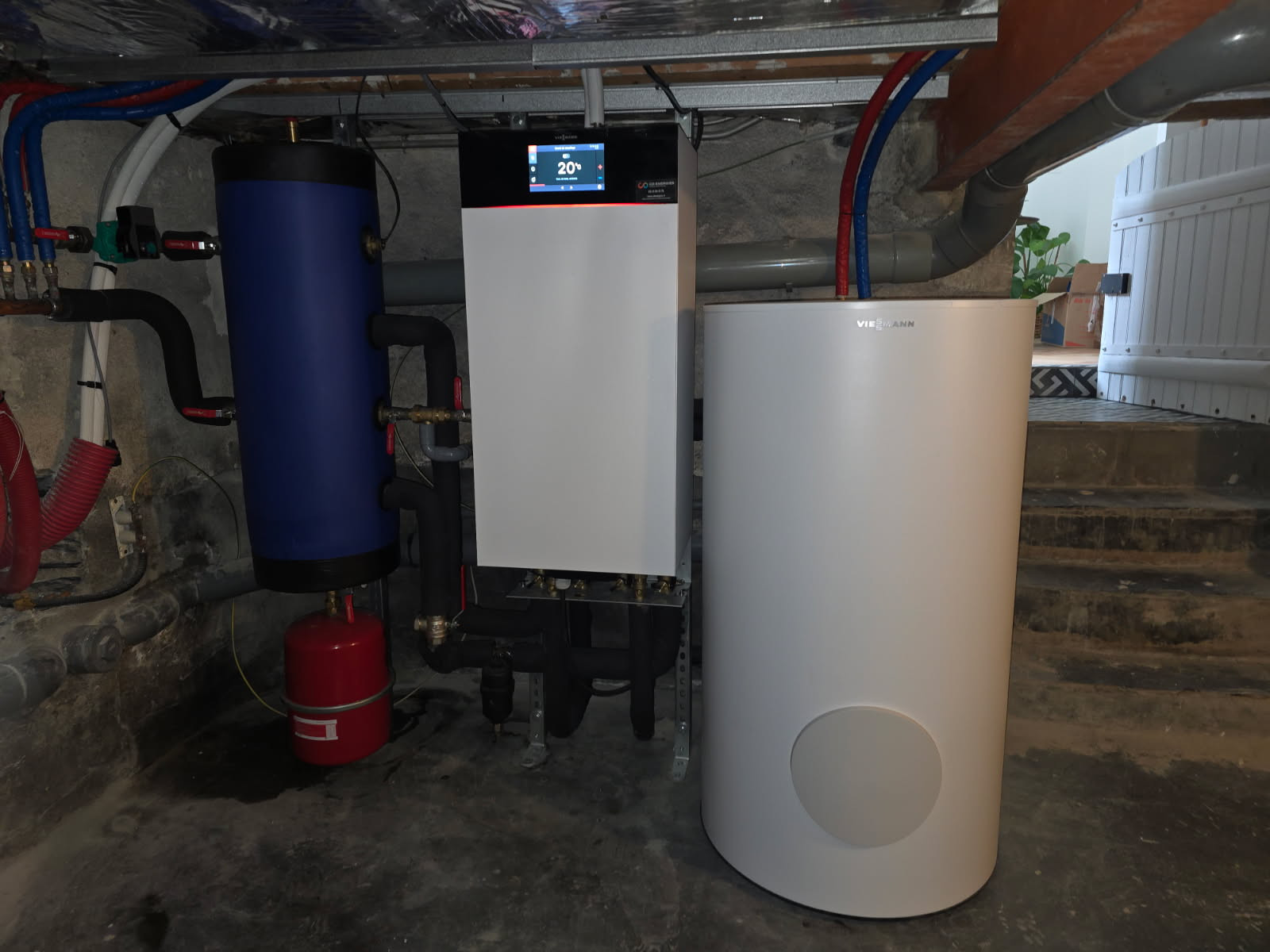 Installation d’une pompe à chaleur Air/Eau Viessmann modèle : Vitocal 200 S en remplacement d’une pompe à chaleur sur la commune Saint Denis d'Anjou 53290 dans le Mayenne (53)